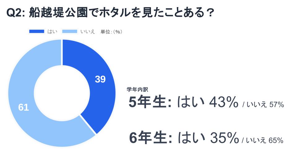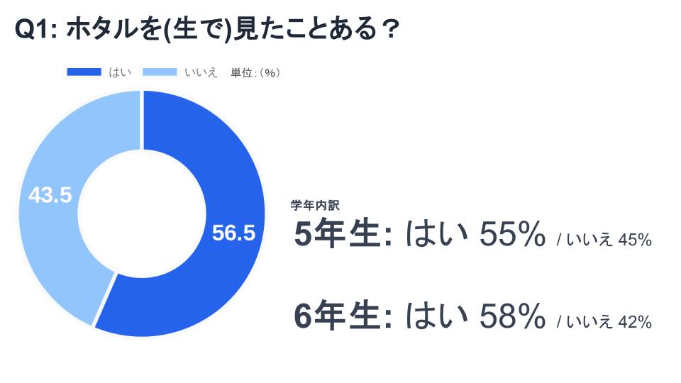 船越堤公園の最寄りの小学校である「船越小学校」の5、6年生にホタルに関するアンケートを取ったところ、以下の通り、「船越堤公園のホタルが増えて欲しいと願う気持ち」や、「ホタルを