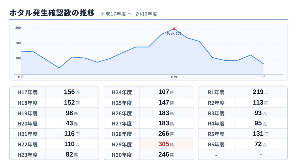 右図の通り、H29年度をピークに年々ホタルの数が減ってしまっています。